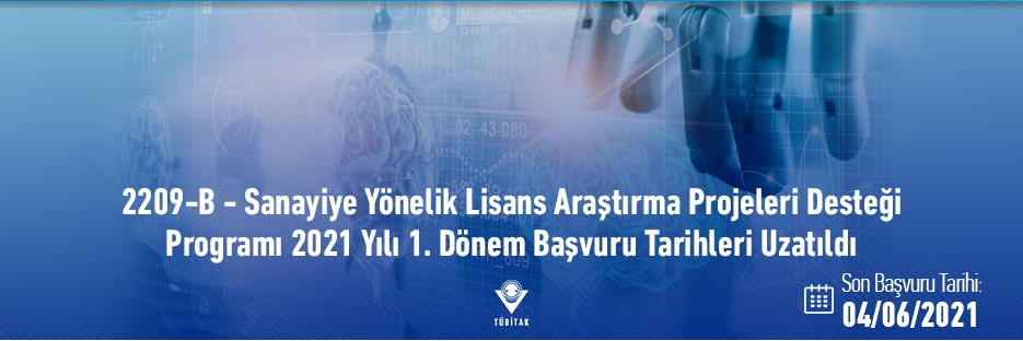2209-B - Sanayiye Yönelik Lisans Araştırma Projeleri Desteği Programı 2021 Yılı 1. Dönem Başvuru tarihleri uzatılmış olup, ilgili afiş aşağıda sunulmuştur.