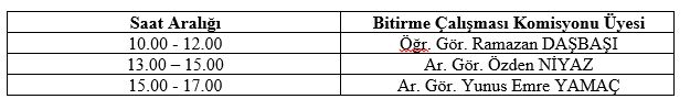 Bitirme Çalışması Ara Raporlarının FR-1488 numaralı form ile birlikte 20 Mart 2020 Cuma günü 10.00 - 17.00 saatleri arasında aşağıda yer alan tablo dikkate alınarak Bitirme Çalışması Komisyonuna teslim edilmesi gerekmektedir.