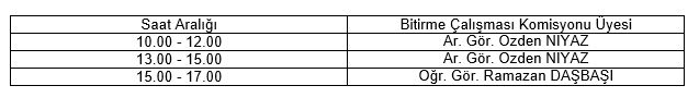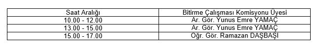 Tasarım Projesi Sonuç Raporunun / Bitirme Çalışması Kitapçığının, FR-1489 YTÜ EHM Bölümü Tasarım Projesi ve Bitirme Çalışması Teslim Formu ile birlikte 1 kopya olarak format onayı için 20 Aralık 2019 Cuma günü 10.00 - 17.00 saatleri arasında aşağıda yer alan tablo dikkate alınarak Bitirme Çalışması Komisyonuna sunulması gereklidir.