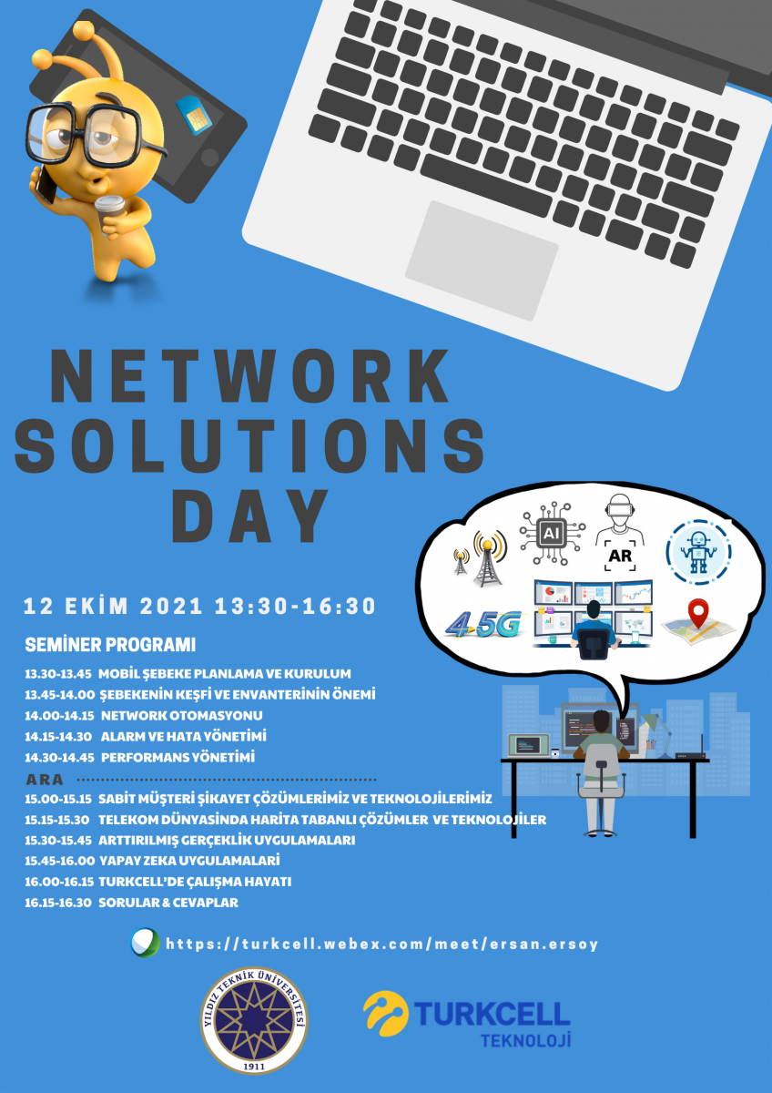 Turkcell Teknoloji- YTÜ EHM iş birliği ile 12 Ekim 2021 Salı 13.30-16.30 arasında Network Çözümleri üzerine eğitimler sunulacaktır. Katılım linki görselde mevcuttur. Tüm öğrencilerimizi seminere bekleriz.